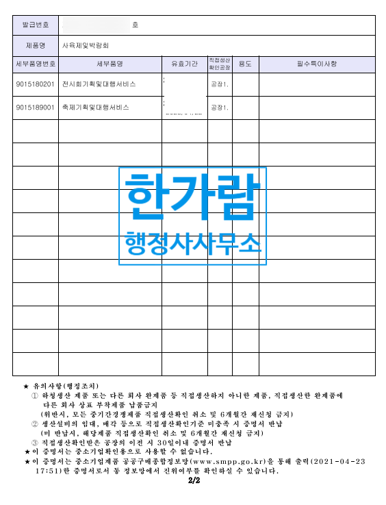 또, 직접생산확인증명서 신청 시 필요한 구비 서류 중 관청 인허가가 필요한 경우가 있는데, 이 경우도 추가 시간이 소요됩니다.