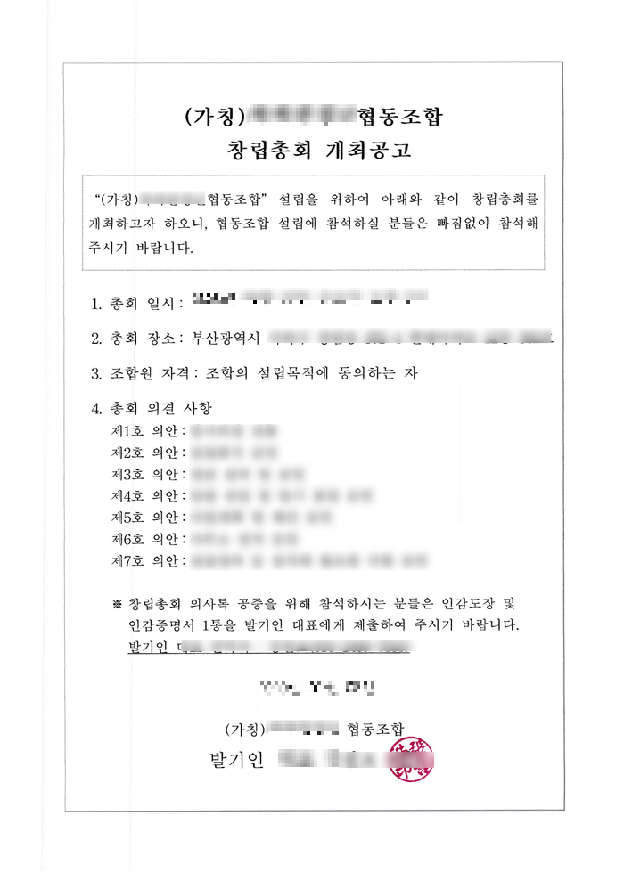 설립을 위해서는 먼저 창립총회를 진행합니다. 창립총회를 한다는 공고문은 7일 전까지 모든 발기인에게 도착해야 합니다.