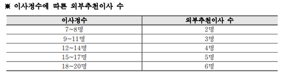이사의 정수는 최소 7명, 감사는 2명인데, 만약 7명으로 이사 선정을 했다면 이중 2명을 외부추천이사로 구성해야 합니다.