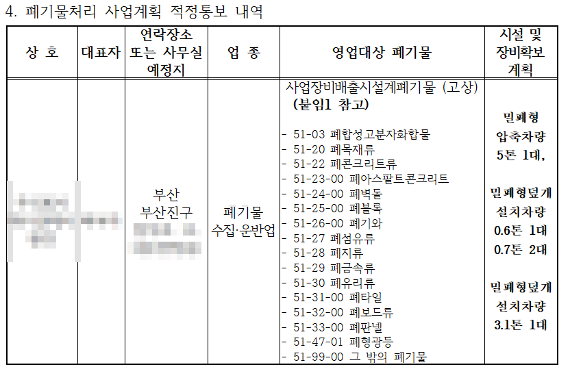 최근 부산진구 에서 사업장비배출시설계폐기물 (고상) 수집운반업 허가 사업계획서 적정통보 사례입니다