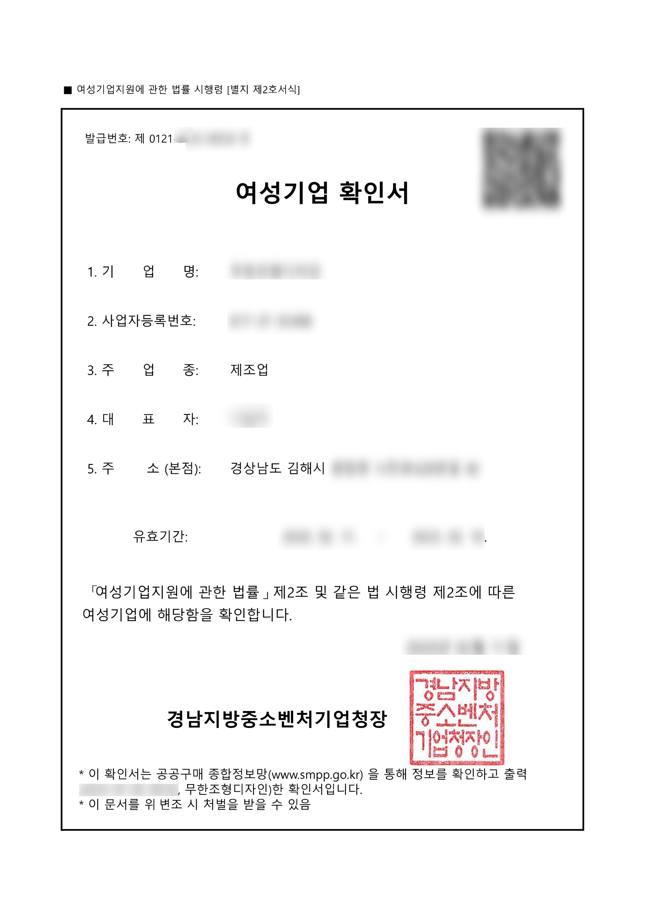 여성대표가 최대 출자자여야하며, 여성기업 확인서 접수 후 현장실사(비대면 조사 포함)를 진행하여 여성대표의 사업에 대한 이해도를 확인합니다.