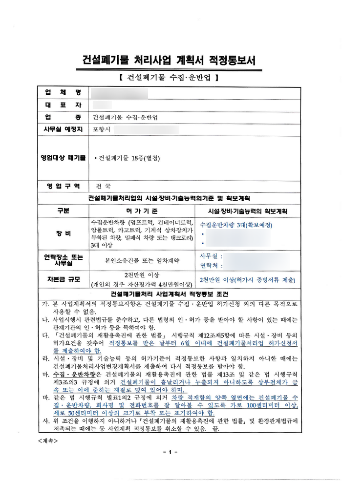 오늘은 포항에서 건설폐기물 수집운반업 허가 사업계획 적정통보를 받은 내용의 포스팅입니다.