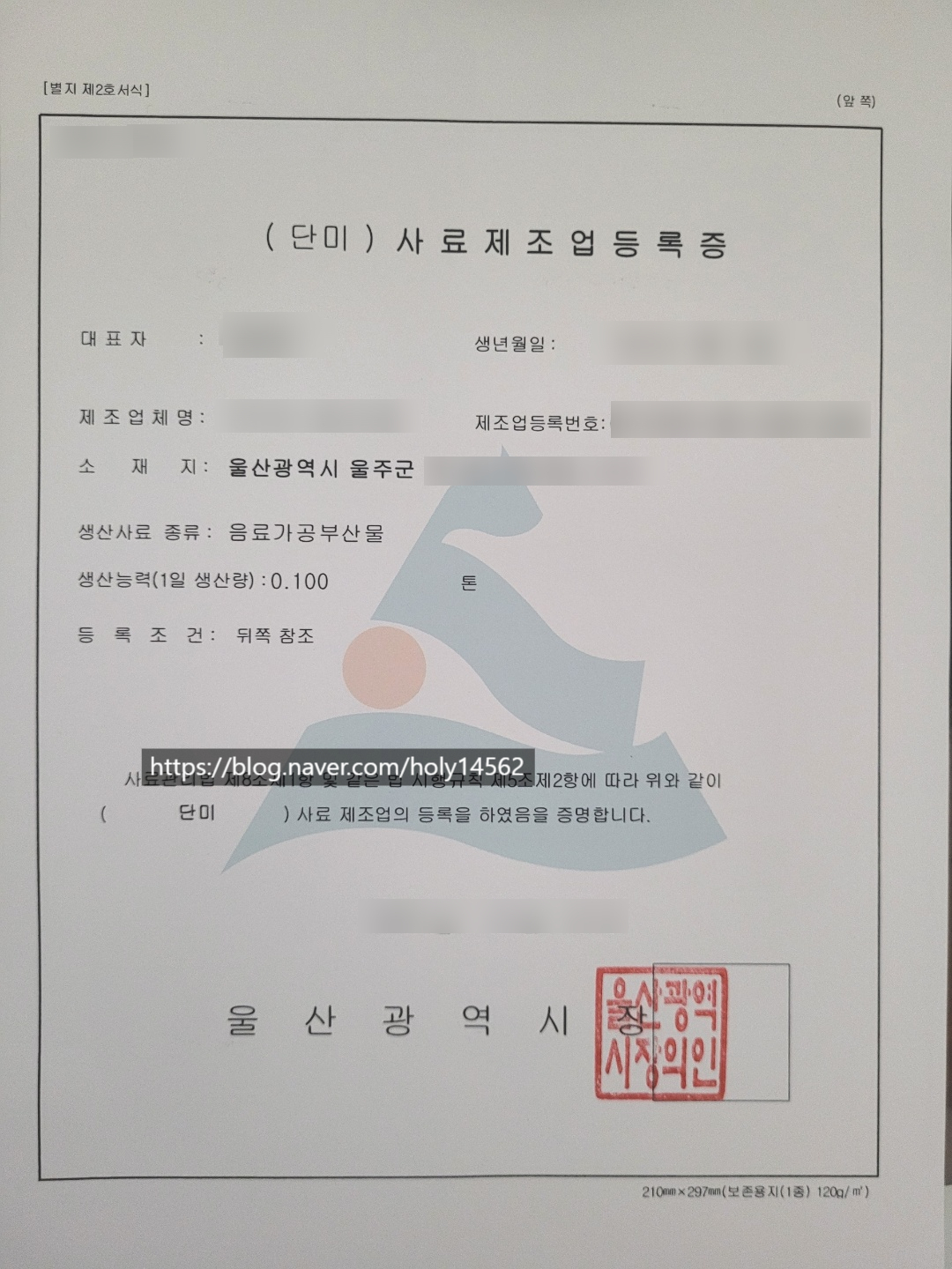 음료가공부산물 단미 사료제조업 등록증 성공 사례입니다.