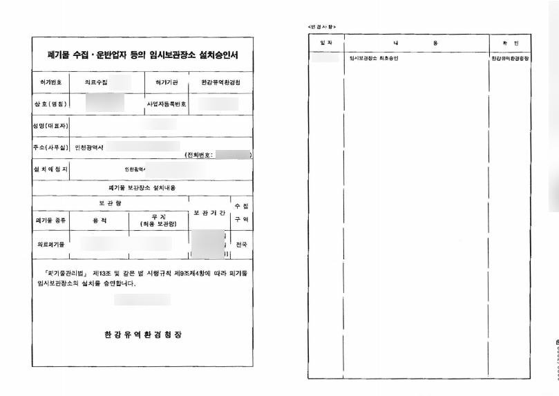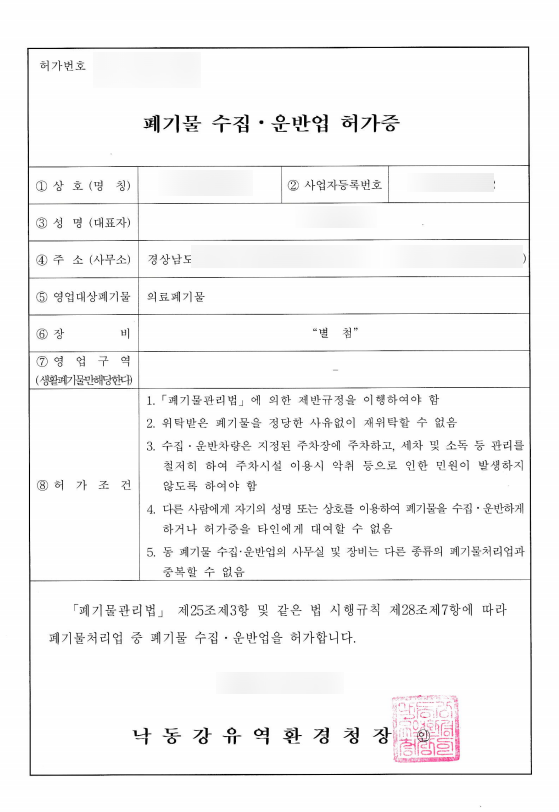 의료폐기물 수집운반업 허가, 의료폐기물 임시보관장소 설치 승인 등 업무가 필요하신 분들은 언제든 연락주시기 바랍니다.