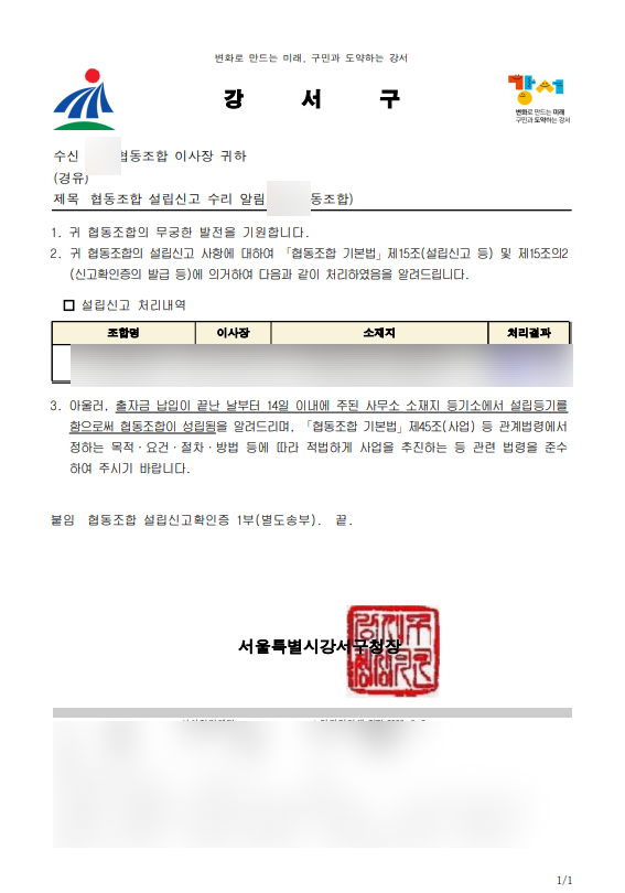 안녕하세요. 이번 협동조합 설립 건은 울산에서 의뢰를 받아 서울에 신고를 하는 것으로 진행되었습니다.
