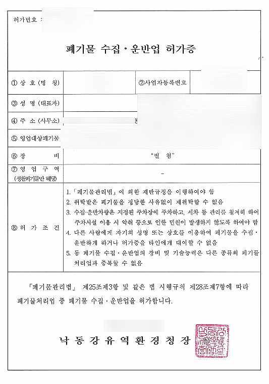 폐기물 수집운반업, 배출계 및 비배출계 수집운반업 허가에 관한 상담, 업무가 있으신 경우 언제든 연락주시기 바랍니다. 감사합니다.