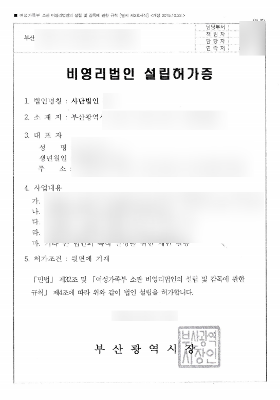 정관, 회의록, 회원명부, 실적 등 다양한 서류가 필요하며, 1년 활동에 100명 회원이란 기준이 까다로운 편입니다. 대신, 기본재산 등 재산 문제가 없기 때문에 그런 면에서는 자유롭습니다.