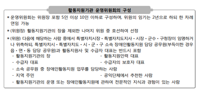 활동지원기관 운영위원회를 구성해 운영해야 하며, 이는 대부분의 사회복지사업과 동일한 형태입니다.
