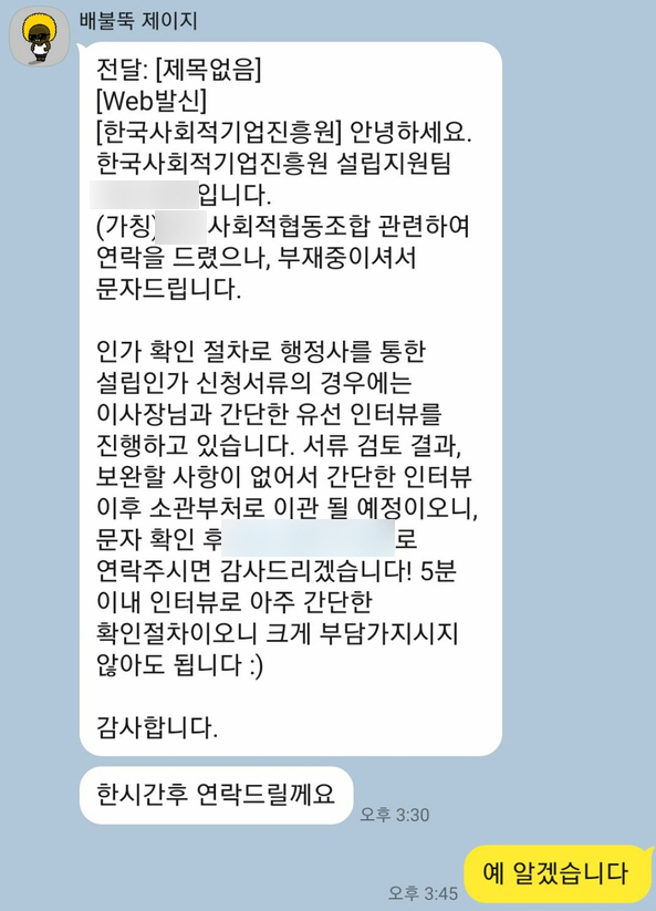 이번 의뢰인분은 다함께돌봄센터 운영을 위해 사회적협동조합 설립이 필요했는데, 약 10일 정도 전에 연락을 주셨습니다.