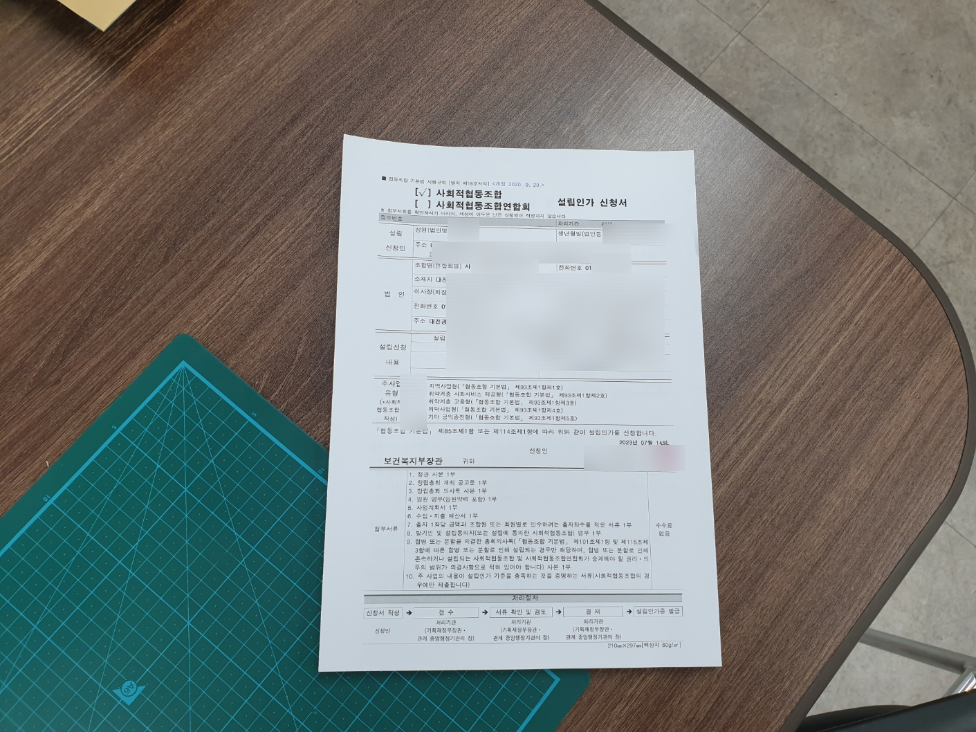 사회적협동조합은 필요한 서류들이 많이 있고, 임원들의 인감으로 간인, 날인해야 합니다.