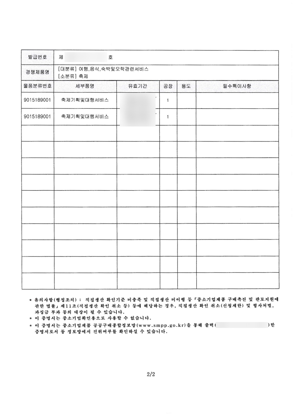| 전시회 기획 및 대행서비스 / 축제 기획 및 대행서비스 / 기타 행사 기획 및 대행서비스 직생 / 직접생산확인증명서 재발급 완료 (0) | 2025.12.17 |